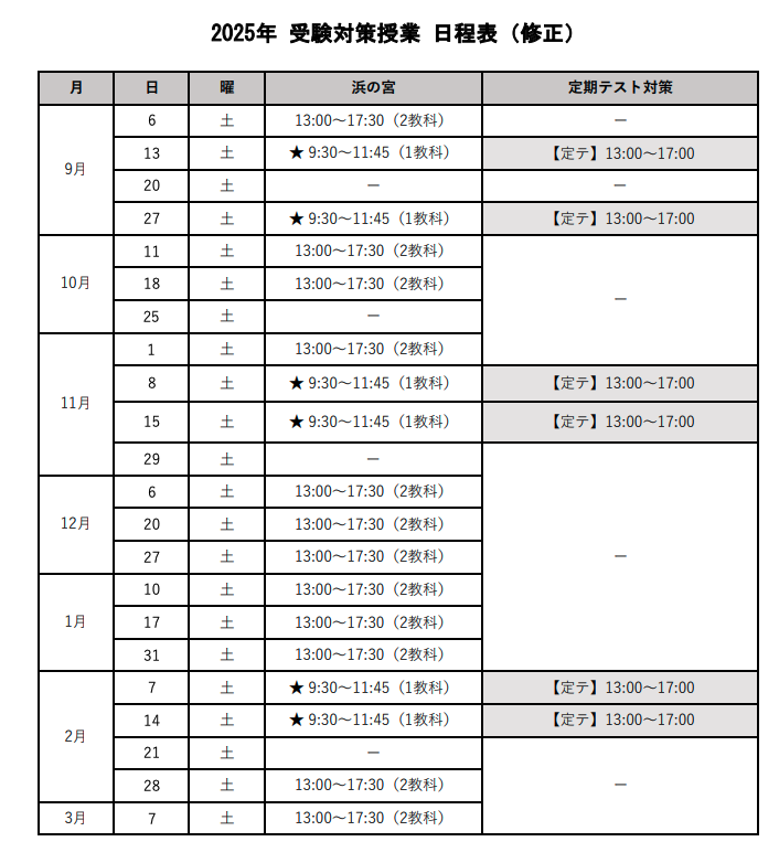 - 試験形式の授業のため、遅刻厳禁(5〜10分前通塾)で通塾してください。