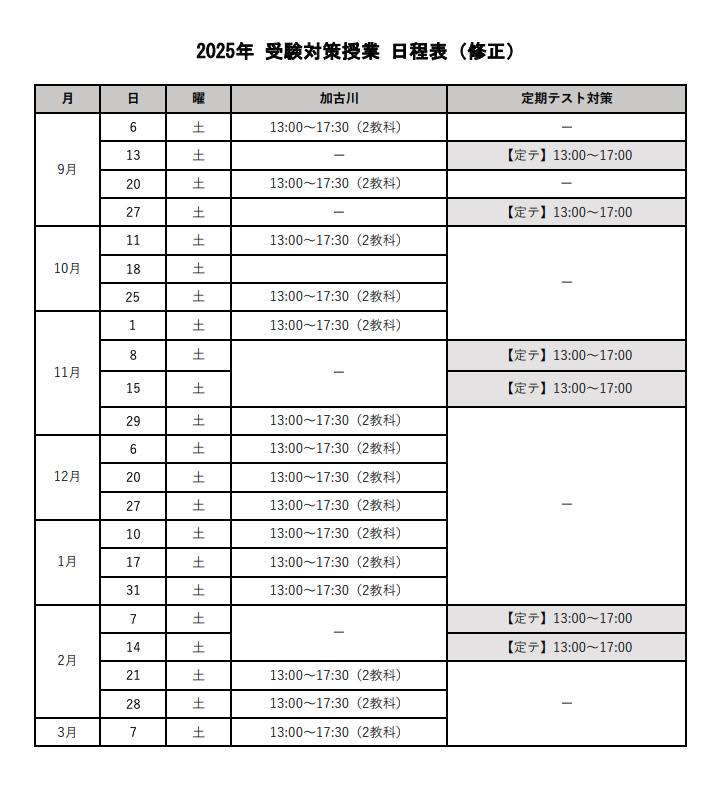 - 欠席時の振替はできませんが「自己演習+問題解説」は平日の自習時間に行います。